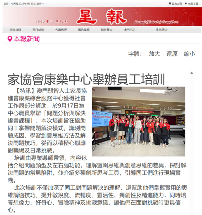 本會轄下康樂綜合服務中心獲得社工局的部分資助,於日前為中心職員安排了「問題分析與解決證書課程」。