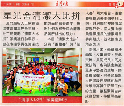 本會轄下星光舍獲得社工局資助,於日前舉辦了「清潔大比拼」活動,旨在表揚學員們在清潔技能方面的顯著進步,並衷心感謝每一位學員為提升院舍清潔品質所付出的努力。
