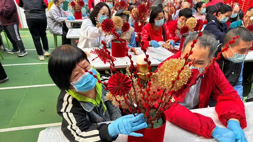 活動開始,工作員先向學員和家長講解製作步驟及注意事項,隨即派發製作材料,學員和家長便開始製作銀柳福桶。活動過程中,學員與家長緊密合作,共同點綴著寓意吉祥的福桶作品。漸漸地,一盆盆喜氣洋洋、充滿新年氣氛的銀柳福桶陸續完成。每盆銀柳福桶的風格獨一無二,象徵著學員和家長的心意,對新年的美好期許。