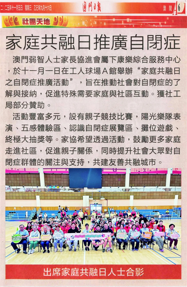 本會轄下康樂綜合服務中心日前假工人球場A館舉辦「家庭共融日之自閉症推廣活動」,是次活動旨在推動社會對自閉症的了解與接納,促進特殊需要家庭與社區的互動,內容豐富多元,所有參加者都踴躍參與,體現共融的氣氛。活動獲社會工作局部分贊助。
