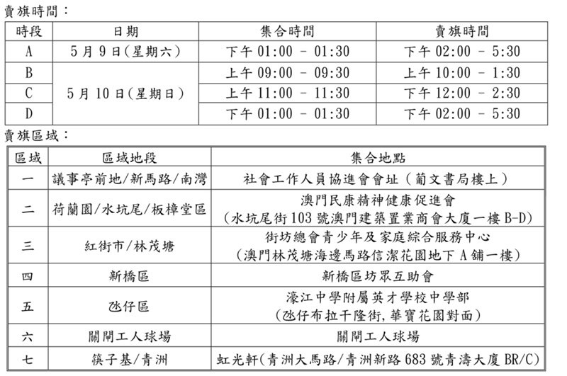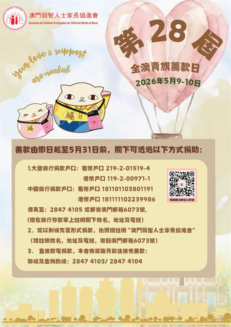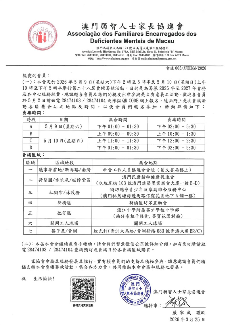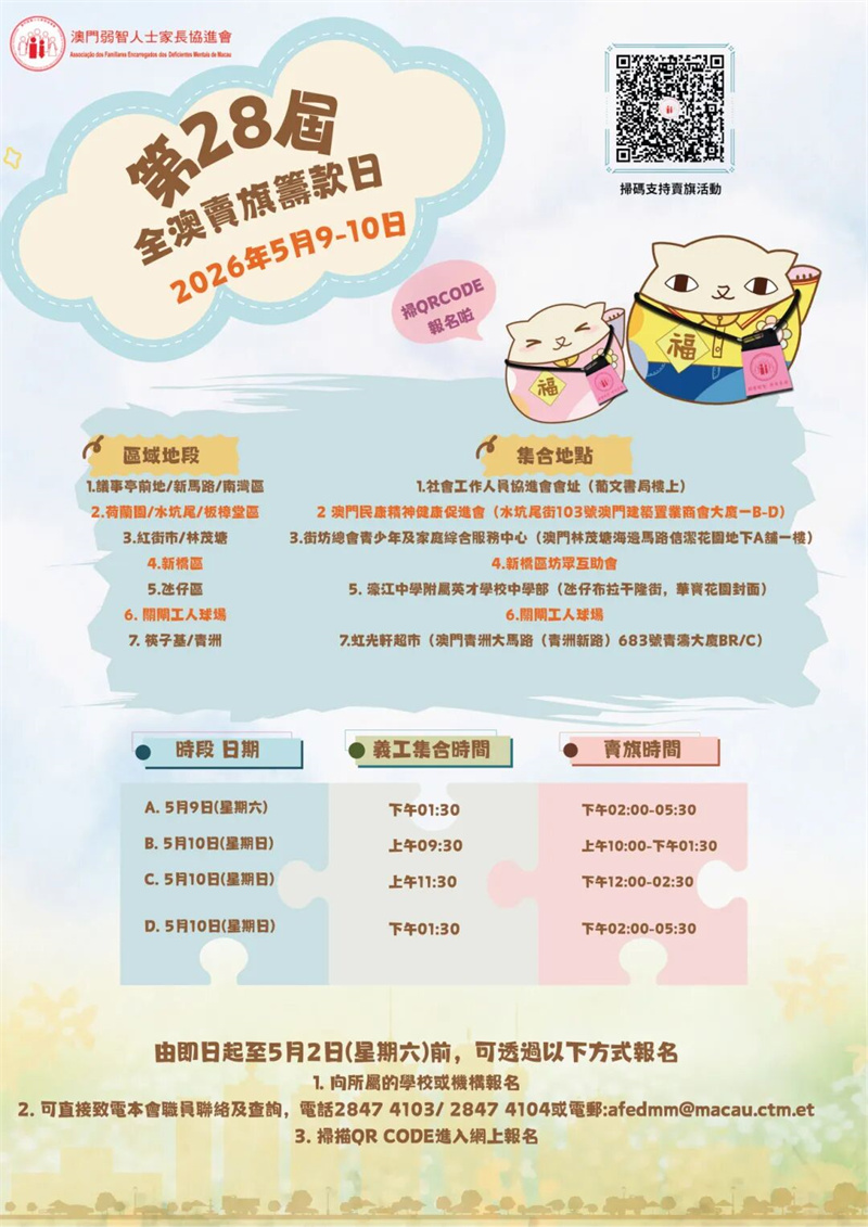 本會定於2026年5月9日(星期六)下午2時至5時半及5月10日(星期日)上午10時至下午5時半舉行第二十八屆賣旗籌款活動,目的是為籌募2026年至2027年會務及各中心服務經費,現誠邀各會員及您們的親友出席參與是次有意義之活動,歡迎各會員於5月2日前致電28474103 / 28474104或掃描QR CODE網上報名,隨函附上是次賣旗活動各區集合站之地點及時間,以便會員們報名參加。