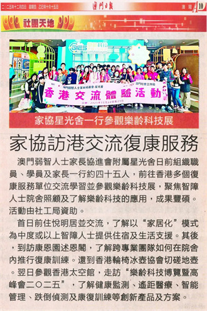 日前,本會附屬星光舍職員、學員及家長,一行44人前往香港多個復康服務單位交流及參觀,聚焦智障人士院舍照顧及了解樂齡科技的應用。是次活動由社工局資助。